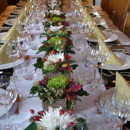 Gerne verwöhne ich Ihre Gäste nach ausführlicher Absprache basierend auf den Wünschen der Gastgeber mit unterschiedlich großen Menüs. Es kann auch ein Buffet bereitgestellt werden, an dem sich die Gäste nach Lust und Laune selbst bedienen können. Ein zum Anlass passend gedeckter Tisch lädt zum Verweilen und Plaudern ein. Auf Wunsch kann auch eine zum Menü passende Weinauswahl angeboten werden.
